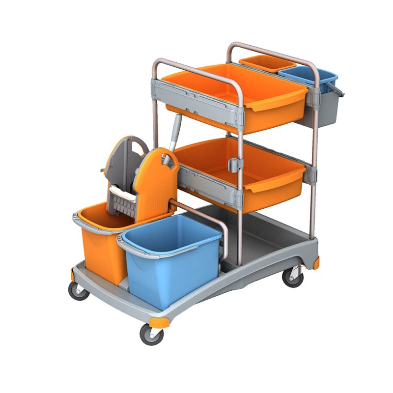 Τhe housekeeping cleaning cart SS012 for hotelmaids is the ideal solution for cleaning narrow spaced hotels and rooms for rent. It is consisted by 2x20lt buckets with wringer , two small buckets x 6lt for cleaning consumables and 2xdeep trays for placing towels , sheets etc...