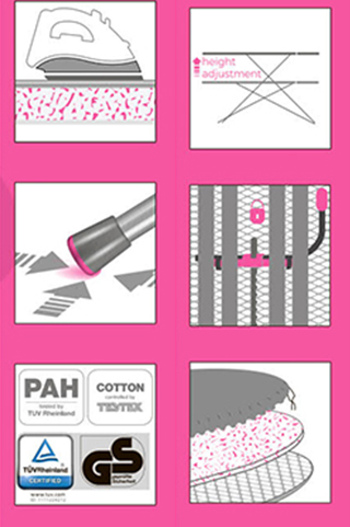 Η σιδερώστρα περιλαμβάνει σιδερόπανο βαμβακερό με εσωτερική επένδυση αφρού 5mm και σχοινί, σε μοντέρνα σχέδια (τα σχέδια ενδέχεται να διαφέρουν από τις φωτογραφίες).